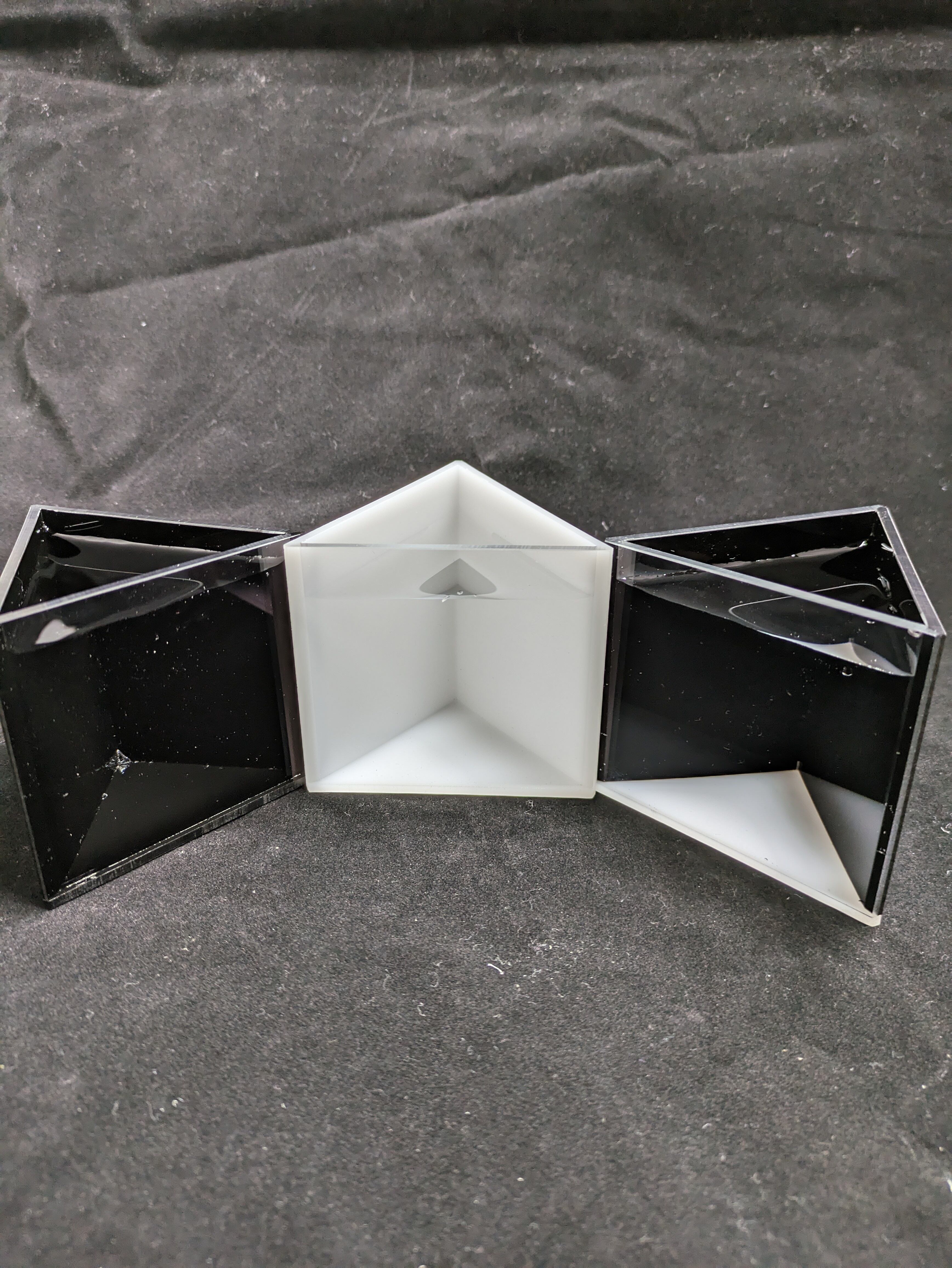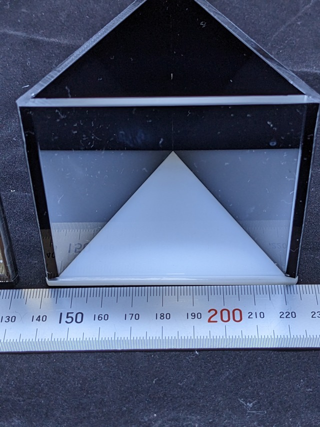 特殊加工のアクリル板を前面に使い、形を三角にする事によ。撮影時の映り込み、反射を極限まで無くした撮影ケースです。
